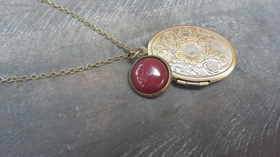 Zauberhaft schönes Medaillon mit zeitlos schönem Rote Jade Anhäner an hochwertiger Bronze-Kette. Das Medaillon ist sehr fein gearbeitet und wundervoll verziert. In der Innenseite lässt sich ein Foto, Bild etc. einkleben. Schließen lässt sich das Medaillon durch einen seitlich angebrachten Druckverschluss, In das Medaillon passt ein Bild (oder auch zwei) von bis zu 22x16 mm.
